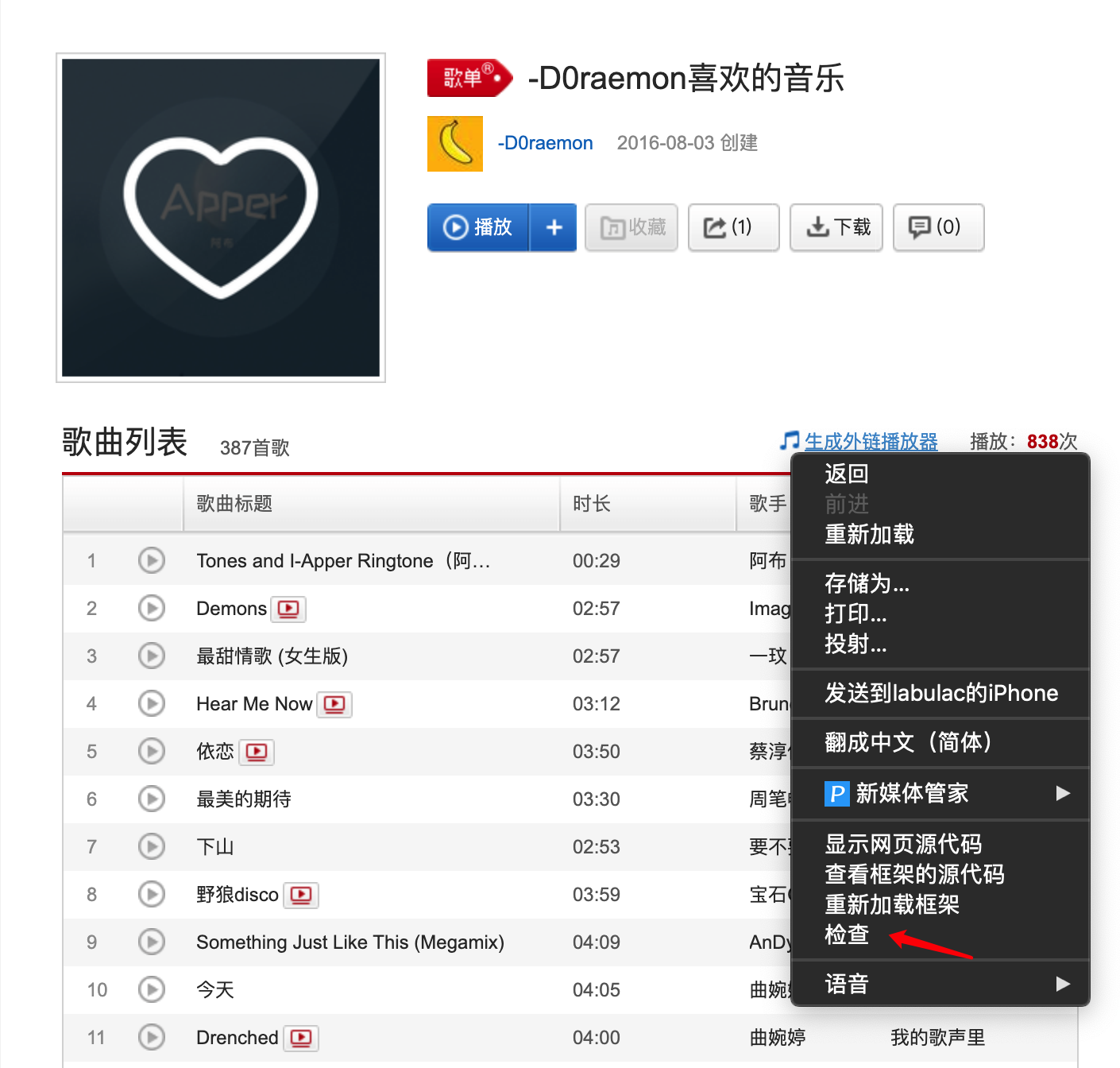 打开歌单页面,在“生成外链播放器”上右击,点击审查元素或者检查;