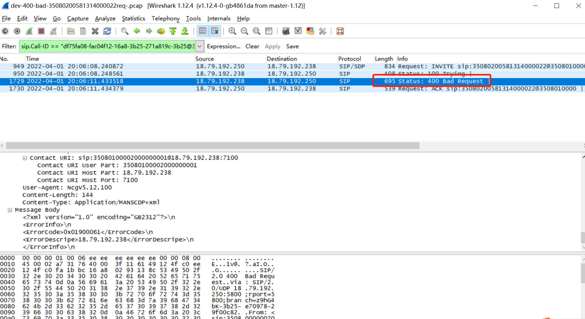 GB28181 排查小结 发表于 2022-04-06 阅读次数: 本文字数: 291 阅读时长 ≈ 1 分钟国标28181注册信令海康下级返回400bad信令过程如上图所示,我方invite,发起视频浏览请求后,海康先回复100try(可以忽略),紧接着回复了400 Bad。我方无法解决,需要联系下级再次抓包一起解决海康下级正常返回信令过程(重要)如图:首先由上级发起invite请求,里面携带了上级的浏览地址20.80.128.104和端口47942然后下级正常返回100try,同样可以忽略。接着下级在200ok中返回其打开的流地址20.80.128.105和端口41088,如图:最后上级进行ack,播放结束后,上级需要发送bye,下级再回复200ok,即可关闭通道。完整的流程结束。热门文章推荐ダイズの部屋pve lxc docker与tun配置欢迎关注微信公众号labulac本文作者: p1ayer本文链接: https://blog.labulac.top/5e6f5e20.html版权声明: 转载本文章请注明出处!