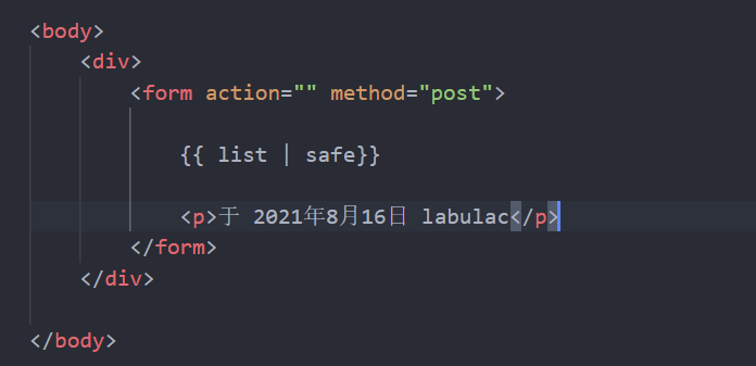 flask给html传递标签p时出现转义字符 发表于 2021-10-16 阅读次数: 本文字数: 375 阅读时长 ≈ 1 分钟参考传值的时候加上|safe即可顺利解决如1234567891011<body> <div> <form action="" method="post"> {{ list | safe}} <p>于 2021年8月16日 labulac</p> </form> </div></body>原本为1234567891011<body> <div> <form action="" method="post"> {{ list }} <p>于 2021年8月16日 labulac</p> </form> </div></body>热门文章推荐pyinstaller 打包文件夹Python3匹配正则用法记录Python便捷生成requirements.txtダイズの部屋pve lxc docker与tun配置欢迎关注微信公众号labulac本文作者: p1ayer本文链接: https://blog.labulac.top/82bbdebe.html版权声明: 转载本文章请注明出处!